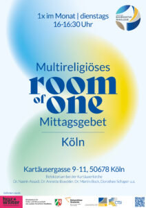Martin Bock: Sie ist im Gespräch mit dem Komponisten und Musiker Bernhard König bei einer Veranstaltung in Köln-Brück mit der dortigen Kulturreferentin Jane Dunker entstanden. Bernhard König hat sein Buch „Musik und Klima“ vorgestellt und nebenbei erzählt, dass er für einige Zeit in Bonn am Forum für Komparative Theologie der Kath.-Theologischen Fakultät angestellt war. Hier ist vor ca. 2 Jahren die Mutter des „Room of One“ entstanden, als ein gemeinsames Gebet aus jüdischen, muslimischen und christlichen Ressourcen. Es findet dort jeden Donnerstag von 14 – 1.430 h im Kapitelsaal des Bonner Münsters statt. Bernhard König hat das Gebet dort musikalisch mitentwickelt, eigene Kompositionen und Lieder geschaffen, die man hier auch abrufen und nachlesen kann. Meine Kollegin Dorothee Schaper und ich sind daraufhin nach Bonn gefahren, haben den „Room of One“ besucht, waren von diesem Konzept sehr angetan und sind mit den Initiatoren Prof. Dr. Klaus von Stosch, Dr. Annette Boeckler und Dr. Nasrin Bani Assadi ins Gespräch gekommen. Recht bald haben wir dann das großzügige Angebot des Forums für Komparative Theologie erhalten, den „Room of One“ auch mit einem Kölner Ableger zu versehen. Und dann haben wir uns verschiedene Räume angesehen, die spirituell für ein solches Multireligiöses Gebet in Frage kommen. Das Refektorium in der Kartause mit seiner kontemplativen, ruhigen Atmosphäre, den schönen Fenstern und der Zugänglichkeit auch von der Kartäuserkirche aus erschien uns dann als ein guter Startpunkt für das Kölner Projekt.