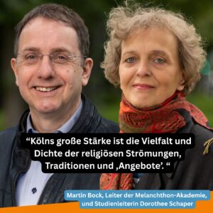 Martin Bock: Den Kölner „Room of One“ gibt es nur durch die Kooperation mit dem Forum für Komparative Theologie. Mit der jüdischen und der muslimischen Mitarbeiterin Annette Boeckler und Nasrin Bani Assadi haben Dorothee Schaper und ich den Kölner Ableger zusammenentwickelt. Frau Boeckler und Frau Assadi werden auch in Köln den jüdischen und den muslimischen Teil gestalten, im christlichen Teil wechseln sich Dorothee Schaper und ich ab. Thomas Frerichs, Kantor der Kartäuserkirche, wird die musikalische Gestaltung übernehmen.